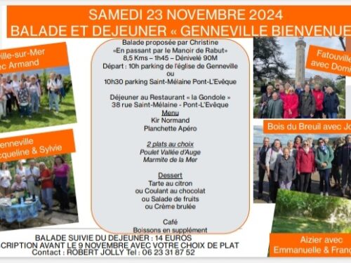 L'Association Genneville Bienvenue organise une randonnée le Samedi 23 Novembre prochain. Celle ci sera suivie du repas annuel de fin d'année. La ballade ...