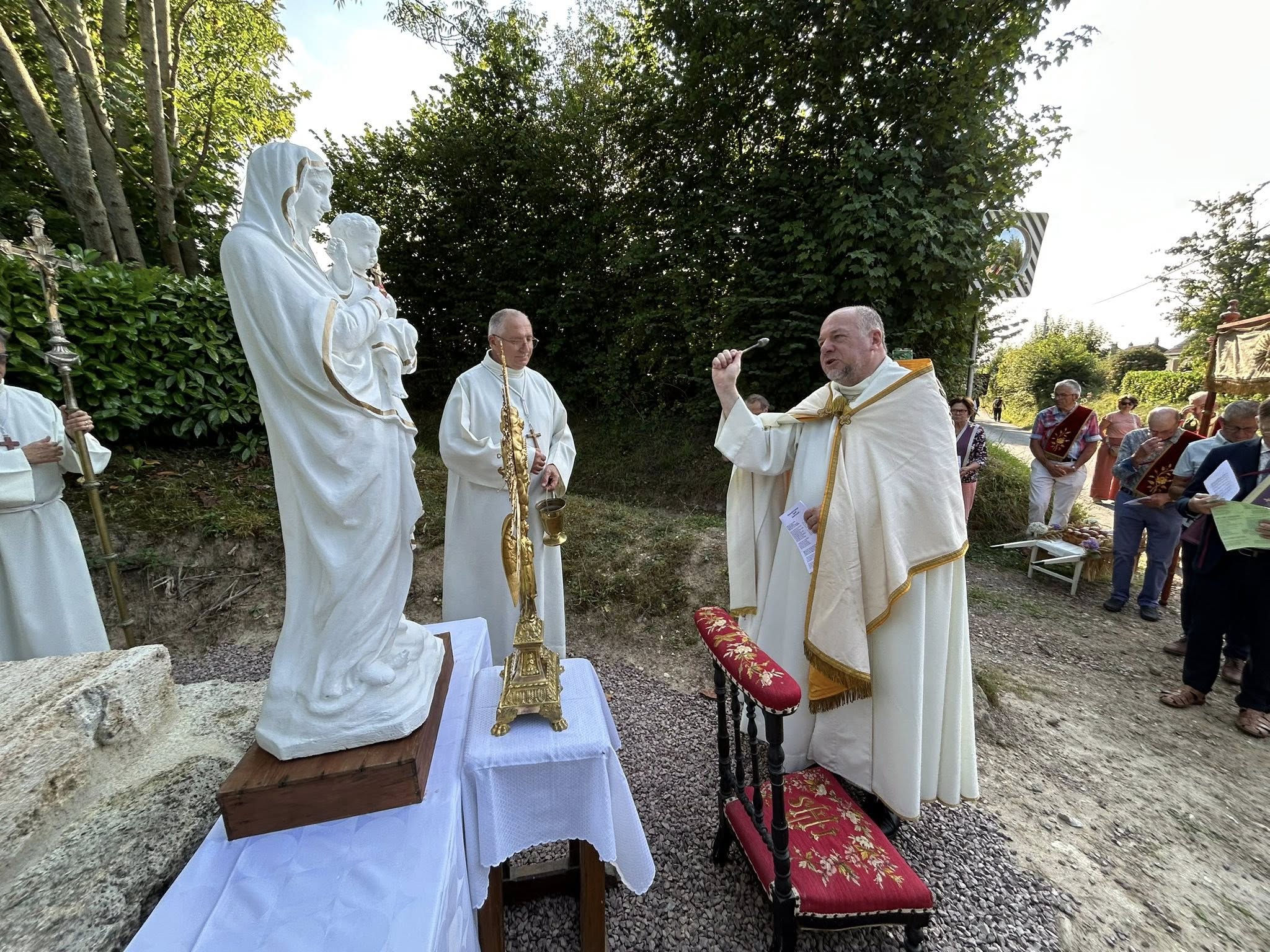 Un arrêt a eu lieu à la statue de Notre Dame du Sacré Coeur comme tous les ans, mais cette année le père MARIE a béni cette statue qui a été restaurée par la confrérie de charité de Genneville.