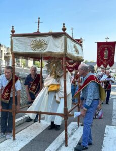 Cette cérémonie a débuté par la procession avec le Saint Sacrement protégé par le dais, datant du 19ème siècle, porté par quatre frères de charité (dont deux de confréries voisines), celles-ci invitées pour participer à la cérémonie.